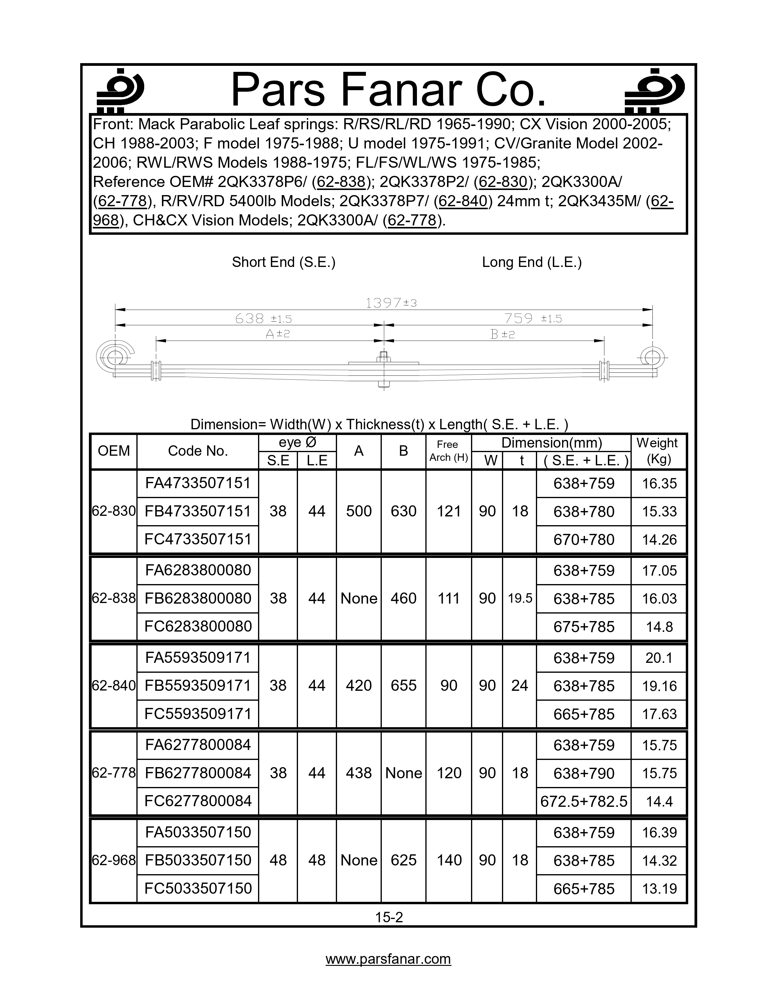Front: Mack Parabolic Leaf springs: R/RS/RL/RD 1965-1990; CX Vision 2000-2005; CH 1988-2003; F model 1975-1988; U model 1975-1991; CV/Granite Model 2002-2006; RWL/RWS Models 1988-1975; FL/FS/WL/WS 1975-1985